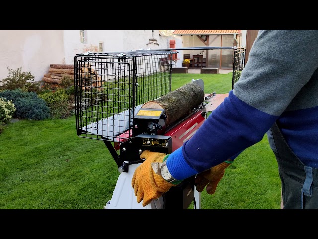 Horisontaalne hüdrauliline puulõhkuja ühefaasilise elektrimootoriga 230 V ja lõhkumisjõuga 5 tonni.